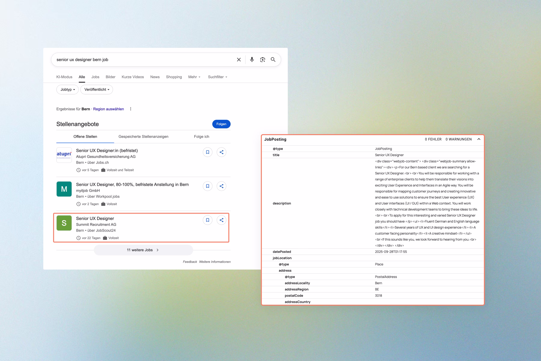 Ein typisches Beispiel wären Job-Veröffentlichungen. Sobald auf einer Seite ein Schema Markup hinterlegt ist, erkennen Suchsysteme automatisch, worum es sich handelt, bspw. um eine Stellenanzeige. So kann die Information nicht nur in den Suchergebnissen, sondern auch in KI-gestützten Tools oder Sprachmodellen korrekt dargestellt werden.
